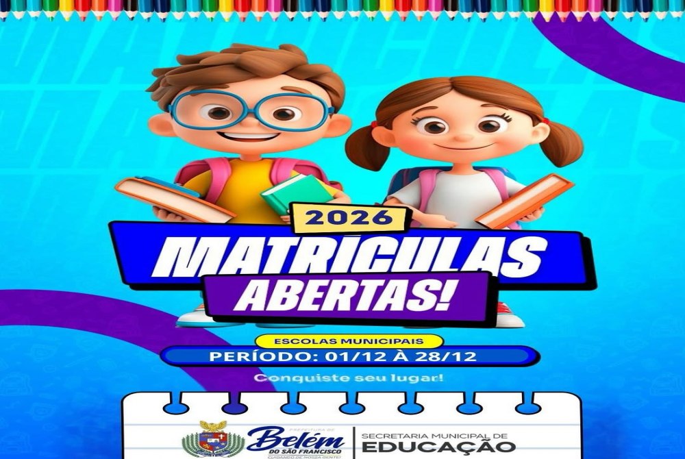 A Prefeitura Municipal de Belém do São Francisco através da Secretaria Municipal de Educação informa que estão abertas as matriculas e rematrículas para o ano letivo de 2026 em todas as escolas da rede municipal.