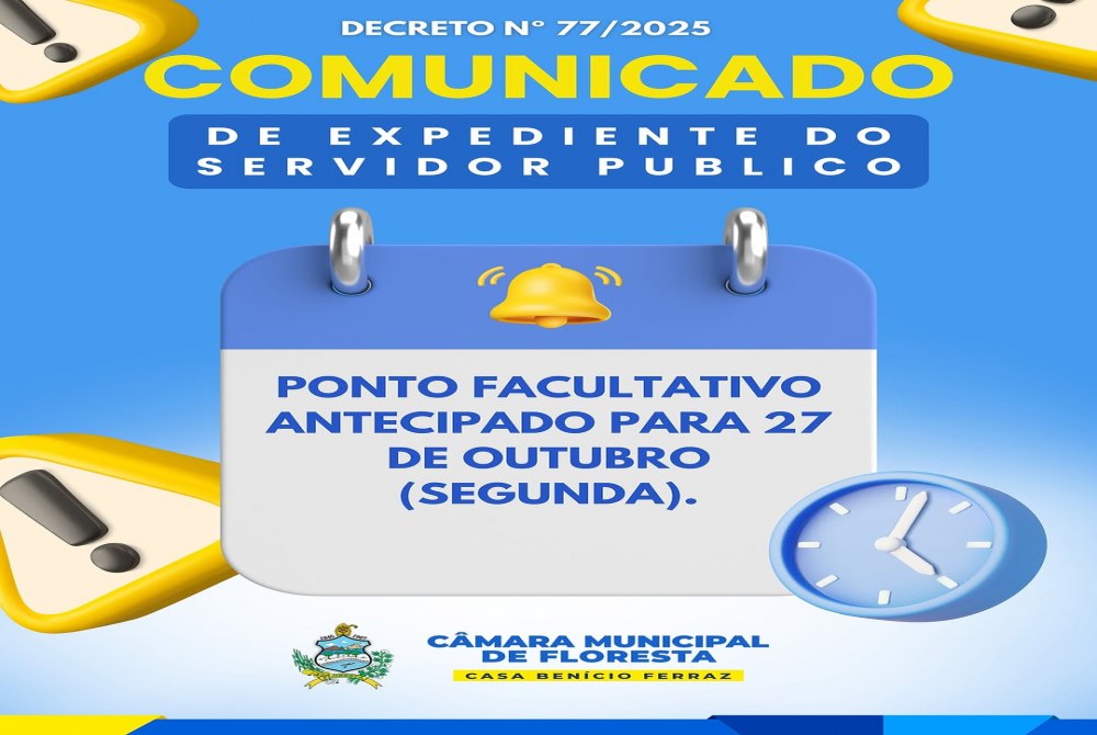 77/2025, a Prefeitura Municipal de Floresta informa que o ponto facultativo referente ao Dia do Servidor Público, comemorado em 28 de outubro, será transferido para o dia 27 de outubro de 2025 (segunda-feira).