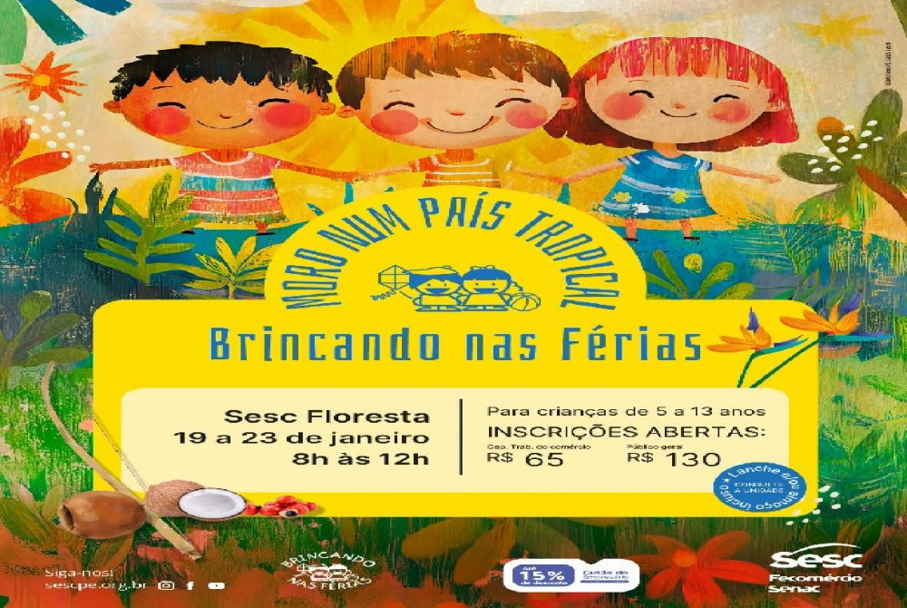 Vem aí mais um BRINCANDO NAS FÉRIAS do SESC Floresta. O evento acontecerá durante 5 dias, de 19 a 23 de Janeiro, pela manhã, das 08 h as 12 h, com a temática "MORO NUM PAÍS TROPICAL".