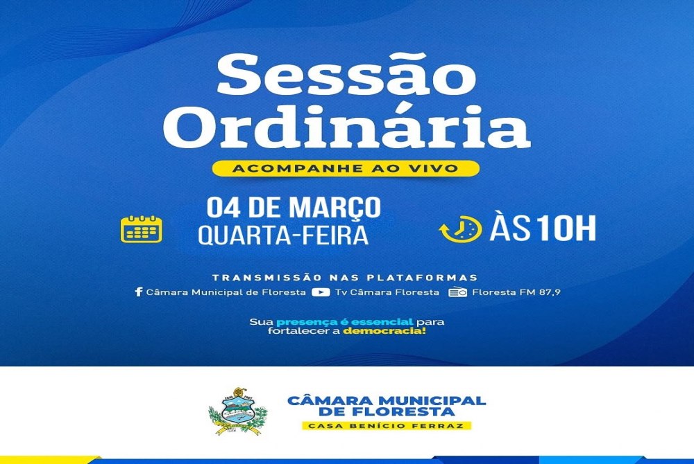 Nesta quarta-feira, 04 de março, às 10h, acompanhe ao vivo mais uma Sessão Ordinária da Câmara Municipal de Floresta – Casa Benício Ferraz.